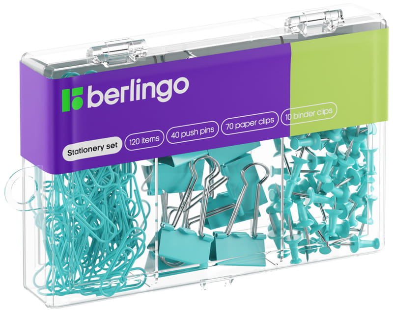 Zestaw niebieski: 70 spinaczy, 40 pinezek tablicowych, 10 klipów, Berlingo
